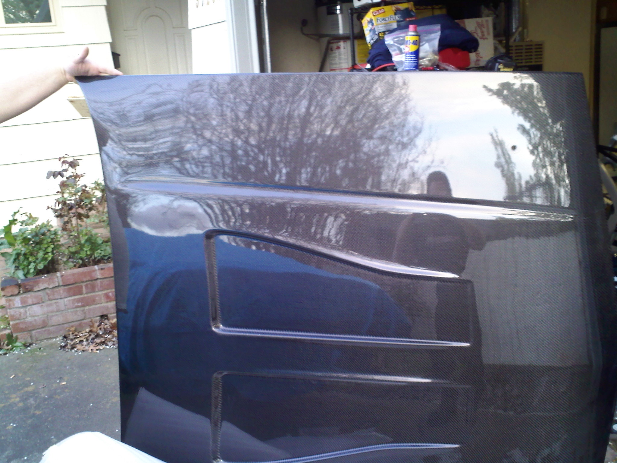 The top is our hand laid carbon fiber (with clear coat) and the bottom side is hand laid fiberglass in a black gel coat. We use a high quality Marine Grade UV clear coat so our hood is ready to bolt on out of the box. You can prep and paint the underside if you so desire.